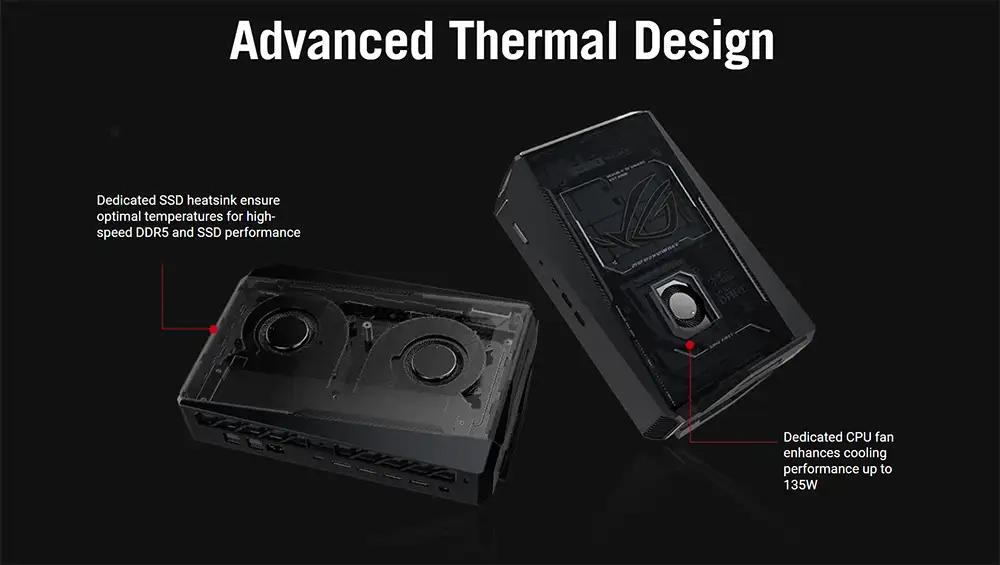 ایسوس برای اطمینان از تعادل میان عملکرد و خنککنندگی، توان پردازنده را روی 75 وات و کارت گرافیک را روی 115 وات تنظیم کرده است. این ترکیب باعث میشود حتی در فشار کاری بالا، سیستم خنک، ساکت و پایدار باقی بماند. ویژگیای که در یک شاسی کوچک، نشان از مهندسی درخشان ایسوس دارد. چنین تعادلی، مینی کامپیوتر گیمینگ ایسوس را به گزینهای ایدهآل برای کاربران حرفهای تبدیل کرده است.